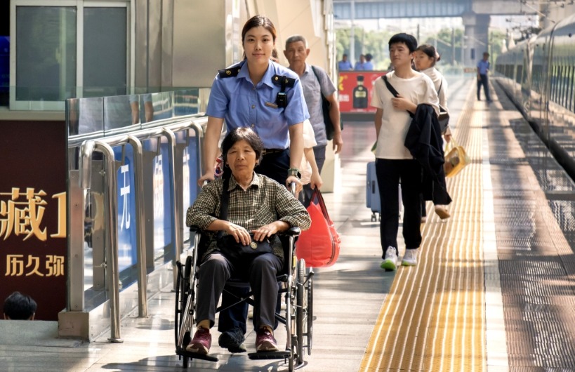 无锡站“太湖明珠”雷锋服务站工作人员为重点旅客出行提供帮扶。 张博伦摄
