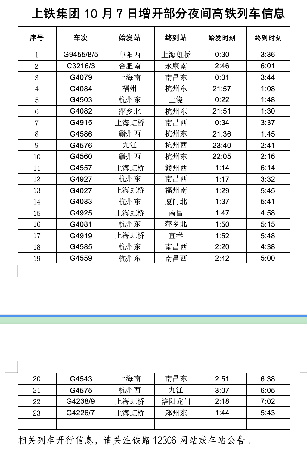 上铁集团在启用高峰运行图的基础上,计划增开155列长三角至南昌、武汉、广州、郑州等方向旅客列车(其中直通旅客列车36列,管内旅客列车119列),组织289列动车组列车重联运行;同时于10月6日、7日计划增开74列夜间高铁列车(其中10月6日增开51列,10月7日增开23列),重点补充阜阳、亳州至上海、合肥,徐州、连云港至上海、南京,合肥、蚌埠至上海,温州、衢州至上海、杭州等管内热门方向,以及南昌、福州、赣州、郑州、青岛往返上海、杭州等直通热门方向的运力,努力满足旅客乘车出行需求。