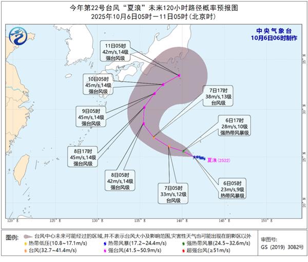 今年第22号台风“夏浪”的中心今天(10月6日)早上5点钟位于日本九州岛东南方向约1350公里的西北太平洋洋面上,就是北纬25.0度、东经141.4度,中心附近最大风力有9级(23米/秒),中心最低气压为990百帕,七级风圈半径160~300公里。