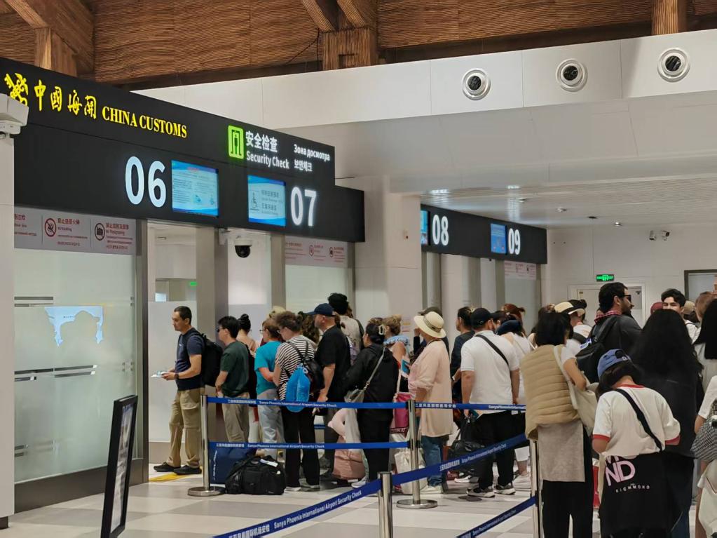 外籍旅客在三亚凤凰国际机场排队等待入境通关安检。新华社记者刘邓摄