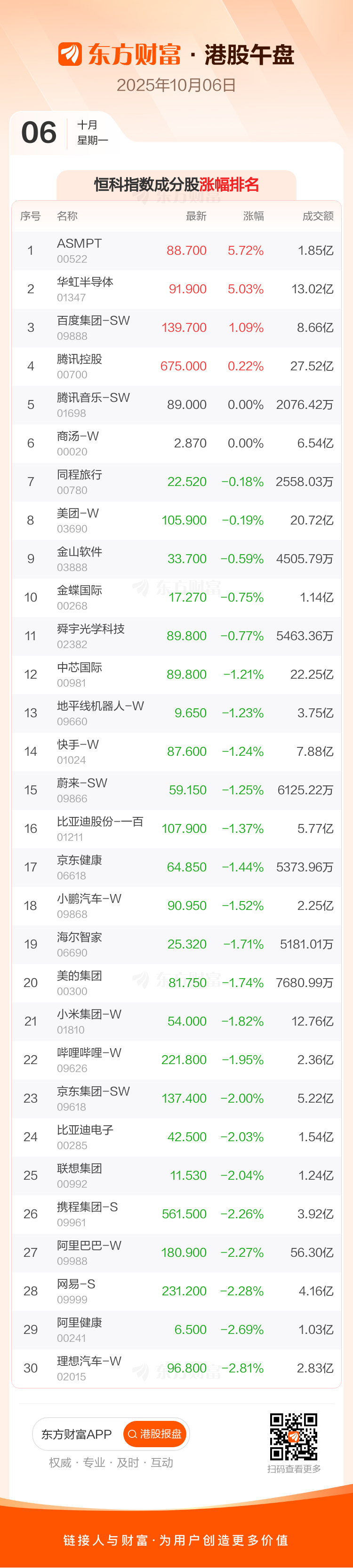 港股10月6日午盘走低 ,恒生指数收报26976.52点,跌164.4点,跌幅0.61%;恒生科技指数收报6543.62点,跌79.23点,跌幅1.2%。恒生指数成分股中紫金矿业、汇丰控股、中通快递-W涨幅居前金沙中国有限公司、理想汽车-W、银河娱乐跌幅靠前恒生科技指数成分股中ASMPT、华虹半导体、百度集团-SW涨幅居前理想汽车-W、阿里健康、网易-S跌幅靠前