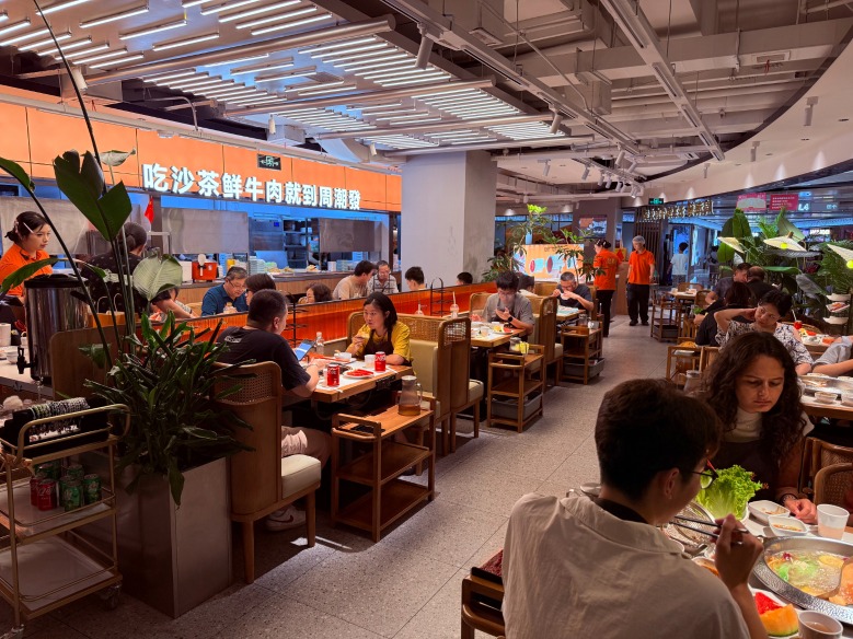 店内服务员穿梭忙碌,为每一桌客人送上新鲜的现切牛肉,空气中飘荡着非遗沙茶酱混合牛骨浓汤的醇香。