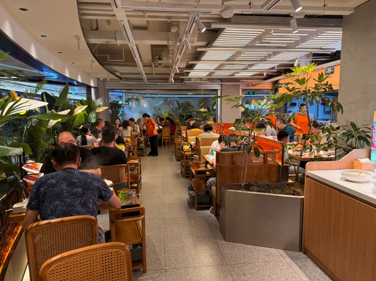 这几天,浦东新区文峰广场四楼中庭的“周潮發·沙茶鲜牛肉火锅”店门外排起了长长的队伍,店内座无虚席,排队区也坐满了等待就餐的消费者,有顾客正在线下排队取号。