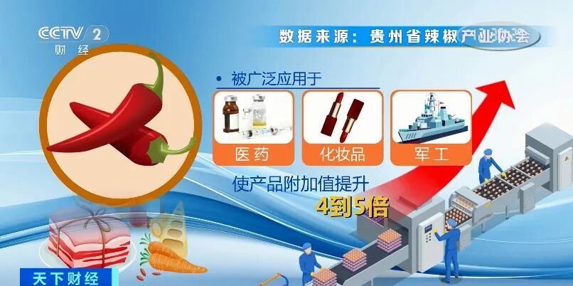 更令人瞩目的是,从辣椒中提取的辣椒素、色素等工业原料,被广泛应用于医药、化妆品、军工等领域,使产品附加值提升4到5倍。