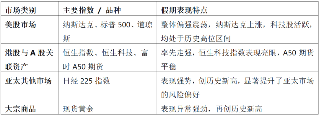 国庆中秋长假期间,国内市场虽按下“暂停键”,但海外市场交易热度不减,整体表现强劲。这份“假期成绩单”不仅为节后 A 股开盘铺垫了积极氛围,更透露出全球市场的多重信号。