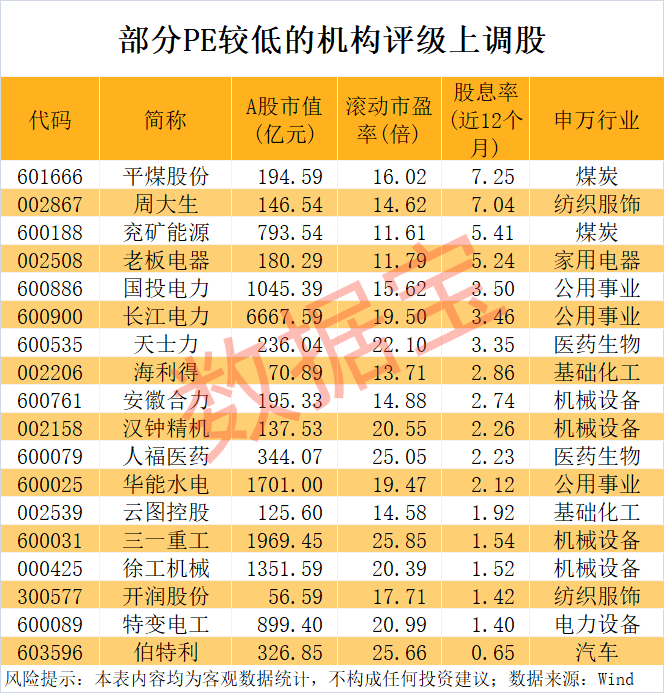 机构上调评级+低PE,18只个股上榜!股息率最高在7%以上