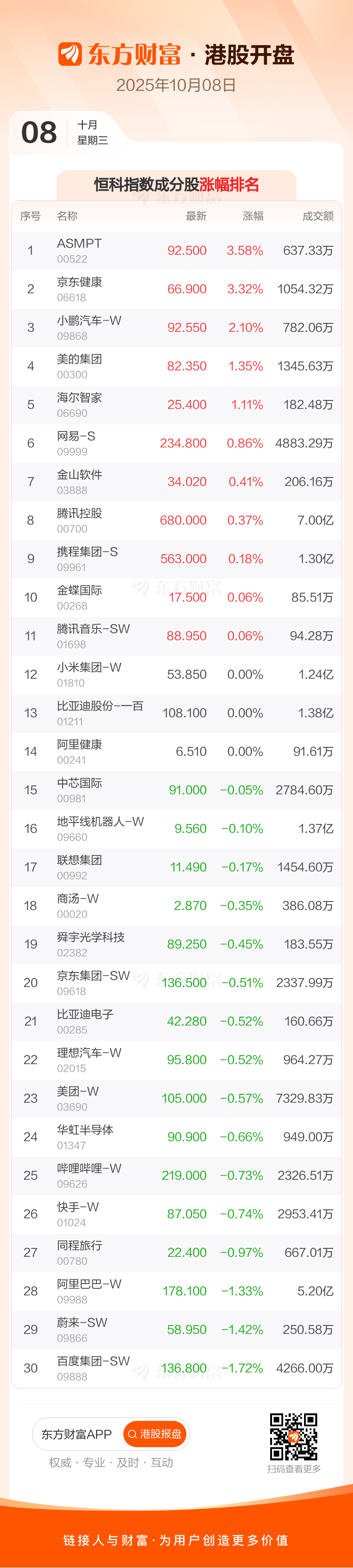 10月8日港股开盘:恒指低开0.21% 科技指数低开0.11%