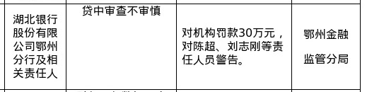 湖北银行鄂州分行被罚30万,涉贷中审查不审慎