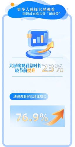 假期的线上文娱消费则呈现大屏化、沉浸式趋势。报告显示,国庆期间优酷观看时长增长主要来自大屏端,环比节前一周上涨23%。动漫、电影、综艺、纪录片四大品类涨幅最大,动漫类节目以76%的涨幅位居榜首。