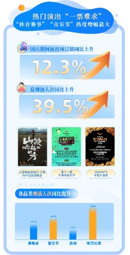 演出市场同样热度攀升。根据报告,10月1日至6日国内演出项目总数已超3100个,近1.5万场次,同比去年上涨约4.4%。总观演人次达194万,同比增长39.5%。体育赛事、音乐节、演唱会成为增长最快的三大品类,观演人次同比增长分别为264%、66.6%和39.7%。