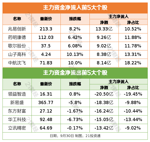 9月30日盘面上,沪深两市成交额2.18万亿元,较上一个交易日放量200亿元。市场热点题材反复活跃,有色金属、存储芯片板块涨幅居前,白酒、大金融等板块跌幅居前。截至收盘,沪指涨0.52%,深成指涨0.35%,创业板指涨0.00%。