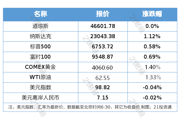 纽约股市三大股指8日涨跌不一。截至当天收盘,道琼斯工业平均指数比前一交易日下跌1.20点,收于46601.78点;标准普尔500种股票指数上涨39.13点,收于6753.72点,涨幅为0.58%;纳斯达克综合指数上涨255.01点,收于23043.38点,涨幅为1.12%。