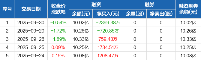 融资方面,当日融资买入2765.32万元,融资偿还5164.7万元,融资净偿还2399.38万元。融券方面,融券卖出0股,融券偿还0股,融券余量0股,融券余额0元。融资融券余额合计10.02亿元。