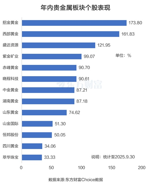 得益于国际金价的拉升,年内A股贵金属板块集体强势。东方财富Choice数据显示,截至9月30日收盘,招金黄金、西部黄金、盛达资源年内纷纷翻倍,涨幅分别为173.8%、161.83%、121.95%。紫金矿业、赤峰黄金、晓程科技年内则累涨超90%。整体而言,13只贵金属概念股,年内悉数上涨,上涨中位数高达87.21%。