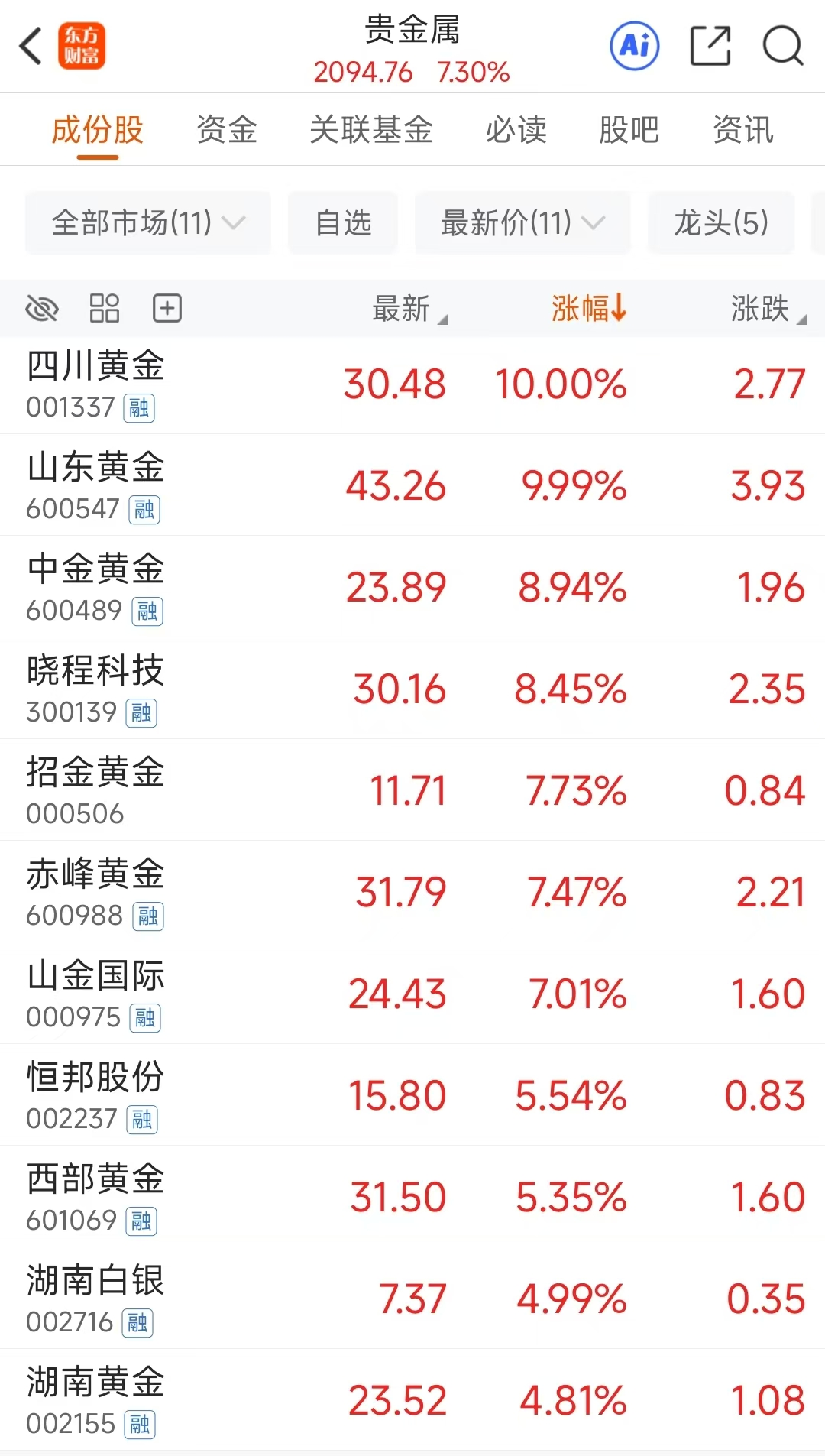 受国庆假期期间金价飙涨带动,10月9日早盘A股贵金属板块强势领涨,早盘收盘时指数大涨7.3%,板块中四川黄金、山东黄金涨停。