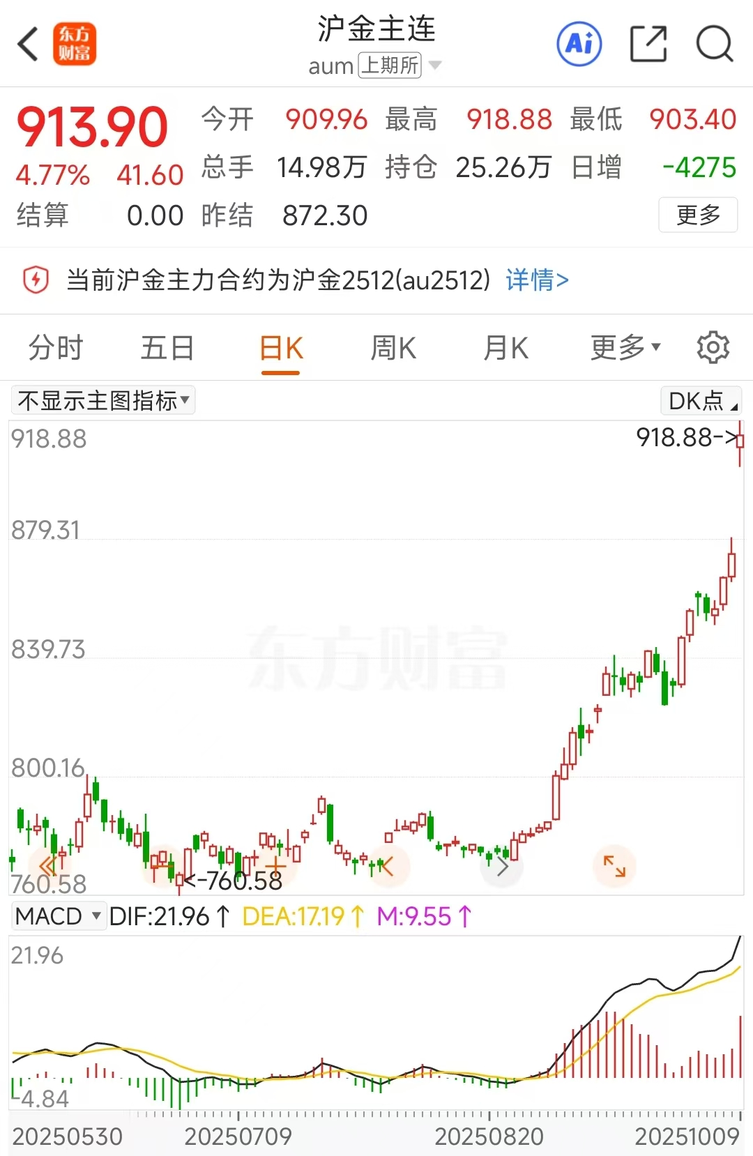 沪金期货主力合约在10月9日也是跳空大涨,突破900元/克关口,创历史新高,早盘收盘时报913.9元/克。相关ETF基金同样纷纷走强,黄金ETF、黄金股票ETF、有色ETF、有色金属ETF、工业有色ETF等纷纷大涨,其中黄金股票ETF早盘收盘时大涨7.95%。