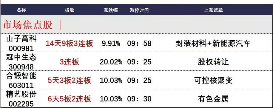 今日午盘全市场共71股涨停,连板股总数7只,22股封板未遂,封板率为76%(不含ST股、退市股)。焦点股方面,低价股山子高科14天9板,股权转让概念冠中生态20cm3连板,有色金属概念精艺股份6天5板,可控核聚变概念合锻智能5天3板。