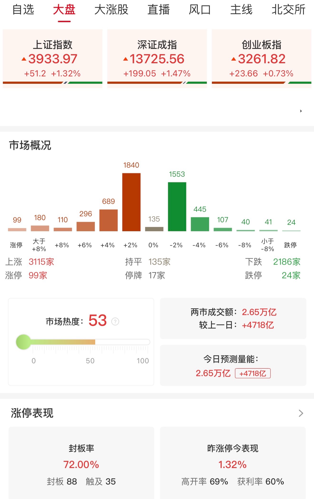 收评:沪指涨1.32%突破3900点 全市场近百股涨停