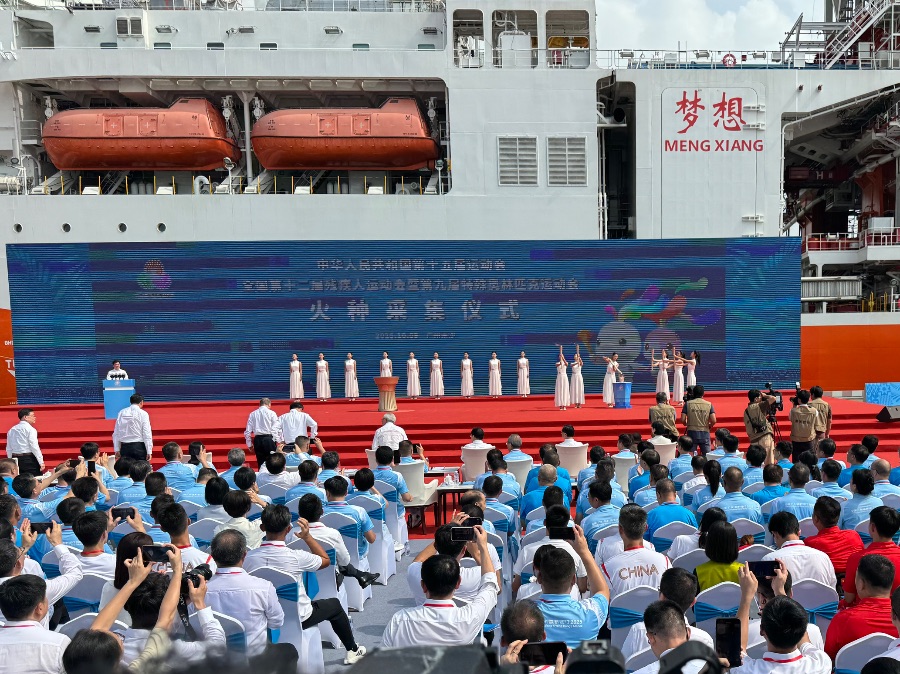 10月9日上午,在“梦想”号大洋钻探船的见证下,第十五届全国运动会和全国第十二届残疾人运动会暨第九届特殊奥林匹克运动会(以下简称“十五运会和残特奥会”)火种采集仪式在广东省广州市南沙科考码头举行。