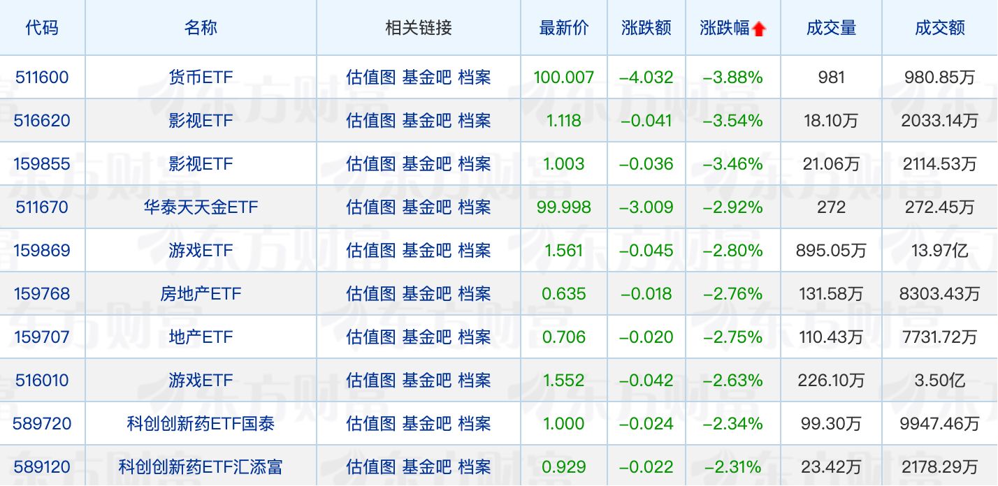 下跌方面,货币ETF、影视ETF跌幅均超过3%。