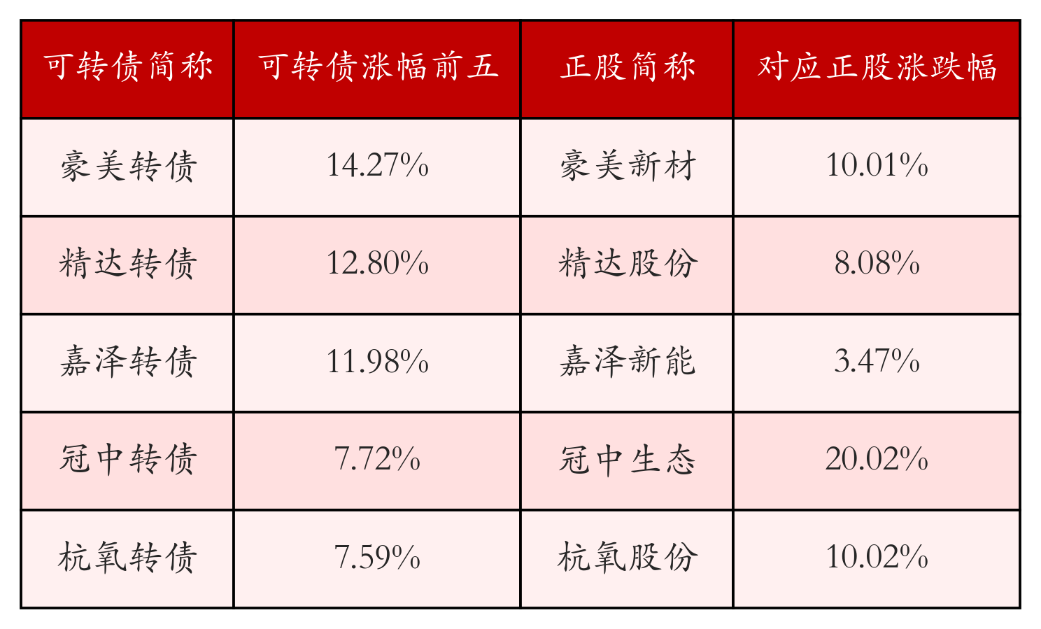 南财智讯10月9日电,南财金融终端盘后数据显示,债市方面,中证转债指数收涨0.48%,报487.81,成交额为653.7亿元。可转债方面,今日共成交415只可转债,其中258只收涨,1只收平,156只收跌。具体来看,46只可转债涨幅超过2%。其中豪美转债(127053)涨14.27%,精达转债(110074)涨12.8%,嘉泽转债(113039)涨11.98%。今日有12只可转债跌幅超2%,惠城转债(123118)跌4.85%,亿田转债(123235)跌4.35%,洛凯转债(113689)跌3.92%。存在交易量的可转债所对应的正股中,245只收涨,10只收平,160只收跌。具体来看,29只可转债对应正股涨幅超过5%,其中,冠中生态(300948)涨停,收涨20.02%;和邦生物(603077)涨停,收涨10.1%。同时所对应的可转债:冠中转债(123207)同涨7.72%;和邦转债(113691)同涨2.93%。今日有6只可转债对应正股跌幅超过5%,明新旭腾(605068)跌停,收跌9.99%。同时所对应的可转债:明新转债(111004)同跌3.22%。