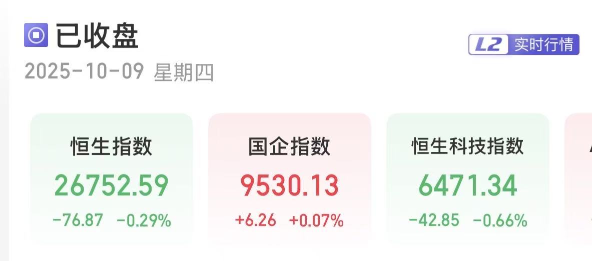 上证报中国证券网讯10月9日,港股三大指数涨跌互现。截至收盘,恒生指数跌0.29%,报26752.59点;恒生国企指数涨0.07%,报9530.13点;恒生科技指数跌0.66%,报6471.34点。