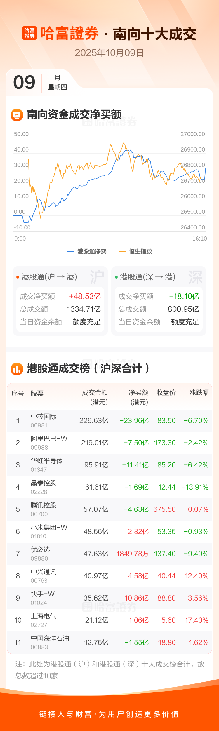 恒生指数10月9日跌0.29%,收报26752.59点。南向资金今日净买入港股30.43亿港元。南向资金今日成交额2135.66亿港元,港股大市成交3868.18亿港元。