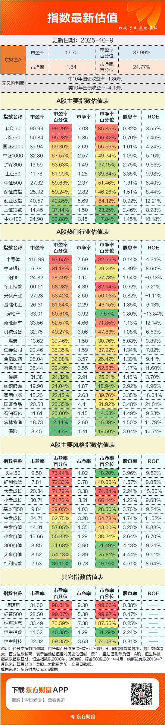 截至10月9日收盘,东方财富Choice数据显示,东财全A市盈率为17.7倍,市盈率百分位为37.99%;市净率为1.84倍,市净率百分位为24.77%。