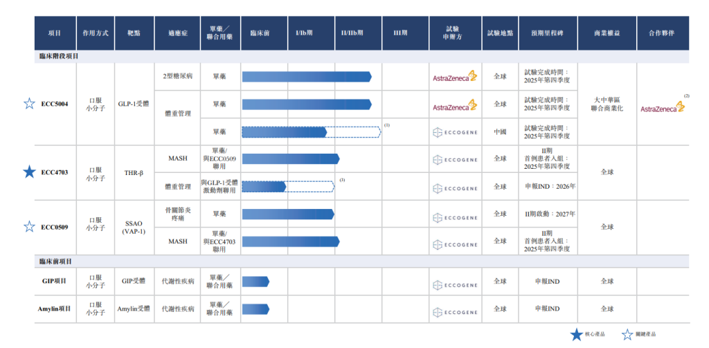 作为单药疗法,ECC4703于2023年10月在美国完成用于健康志愿者及LDL-C(低密度脂蛋白)低于160mg/dL且无需治疗的受试者的一期试验,并于2023年11月在中国完成其作为单药疗法用于健康受试者的一期试验。公司预计在2025年10月获得ECC4703作为单药疗法以及与ECC0509联合用药,为治疗MASH的2a期临床试验IND(临床试验申请)的批准,并预期于2025年第四季度开始试验。此外,公司计划于2026年开展ECC4703与GLP-1受体激动剂联合用药用于体重管理的2a期试验。