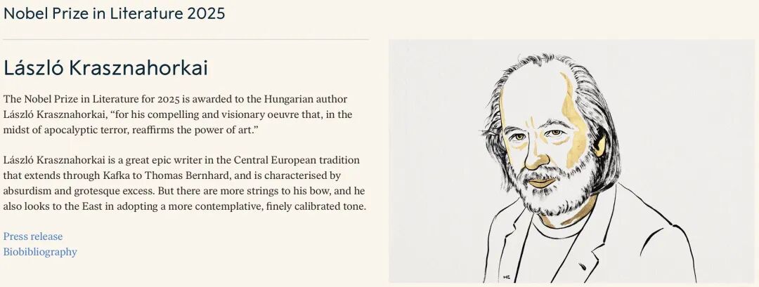 当地时间10月9日,瑞典文学院宣布,将2025年诺贝尔文学奖授予匈牙利作家László Krasznahorkai,“以表彰他引人入胜且富有远见的作品,在世界末日的恐怖中,再次证明了艺术的力量”。