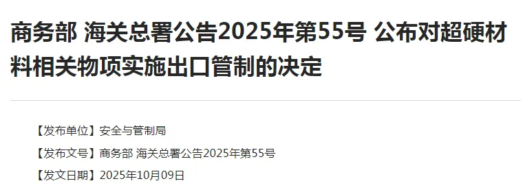 商务部海关总署公告2025年第55号公布对超硬材料相关物项实施出口管制的决定