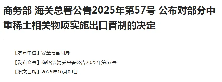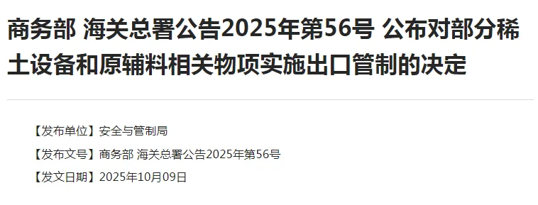 商务部海关总署公告2025年第56号公布对部分稀土设备和原辅料相关物项实施出口管制的决定