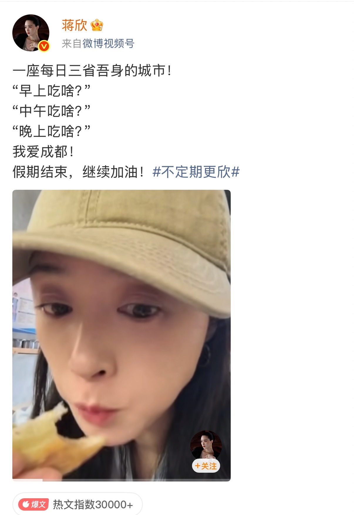10月8日,女演员蒋欣晒出在成都的假期日常,称呼成都是“一座每日三省吾身的城市”,还直言“我爱成都!”视频中,蒋欣晒出了自己在成都享受各种美食的视频,种类丰富,菜品都空盘了,而炫完美食之后,蒋欣还去游泳锻炼。