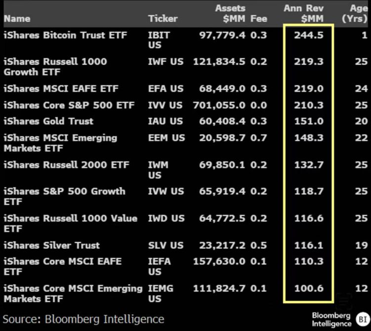 产品资料显示,IBIT的费率为0.25%。而Eric Balchunas提供的数据显示,IBIT一年为贝莱德带来的收入达到2.45亿美元,领先该公司旗下一众成立多年的明星产品。