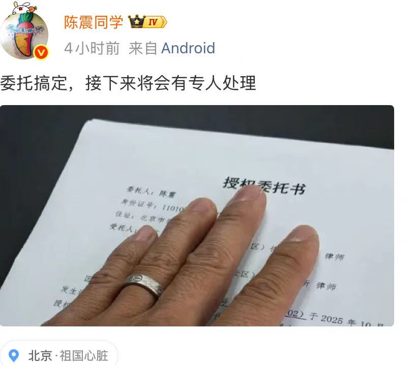 10月9日中午,针对3日发生的北京万寿路交通事故,知名车评人陈震发微博透露该事故的后续处理情况。他在微博中晒出了授权委托书,表示已经委托律师,“委托搞定,接下来将会有专人处理”。配发的图片显示为一份《授权委托书》,委托人为陈震。在评论区,陈震表示是为了“配合对方律师”。