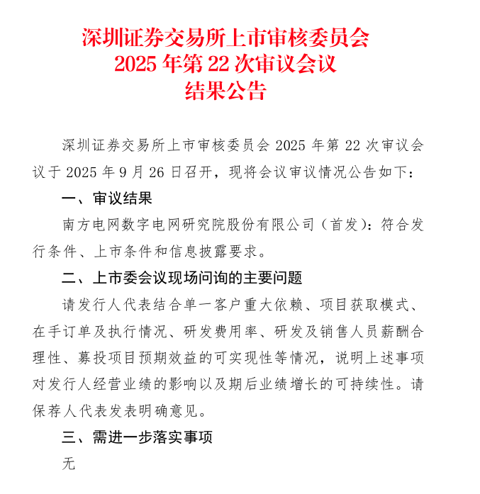 上证报中国证券网讯(记者时娜)深交所官网披露,南方电网数字电网研究院股份有限公司(下称“南网数字”)IPO申请已在近日召开的深交所上市委会议中获审议通过。