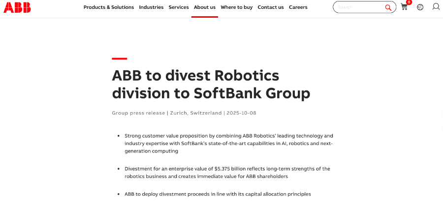 10月8日,ABB宣布已签署协议将其机器人业务单元出售给软银集团,估值53.75亿美元,不再推进此前拟定的机器人业务独立上市计划。该交易尚需获得监管机构批准并满足惯例成交条件,预计将于2026年中后期完成。