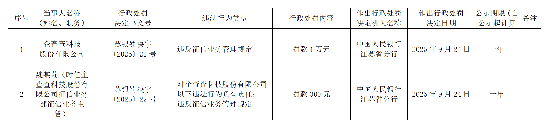 10月9日,中国人民银行江苏省分行发布的行政处罚决定信息公示表显示,企查查科技股份有限公司(以下简称企查查)近日因违反征信业务管理规定被罚款1万元。
