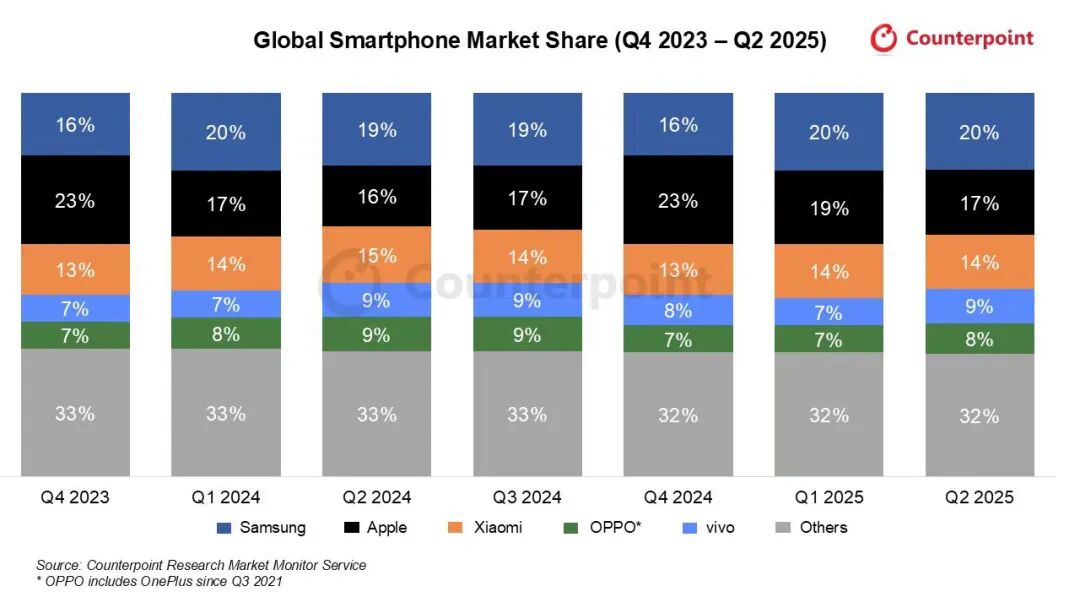 9月底,Counterpoint Research 发布的《全球智能手机市场份额季度数据》显示,在2023年第四季度至2025年第二季度的7个季度中,OPPO(含旗下一加品牌)的全球市场占比始终未能突破10%;与之相比,同期小米的全球市场占比则约在14%左右。