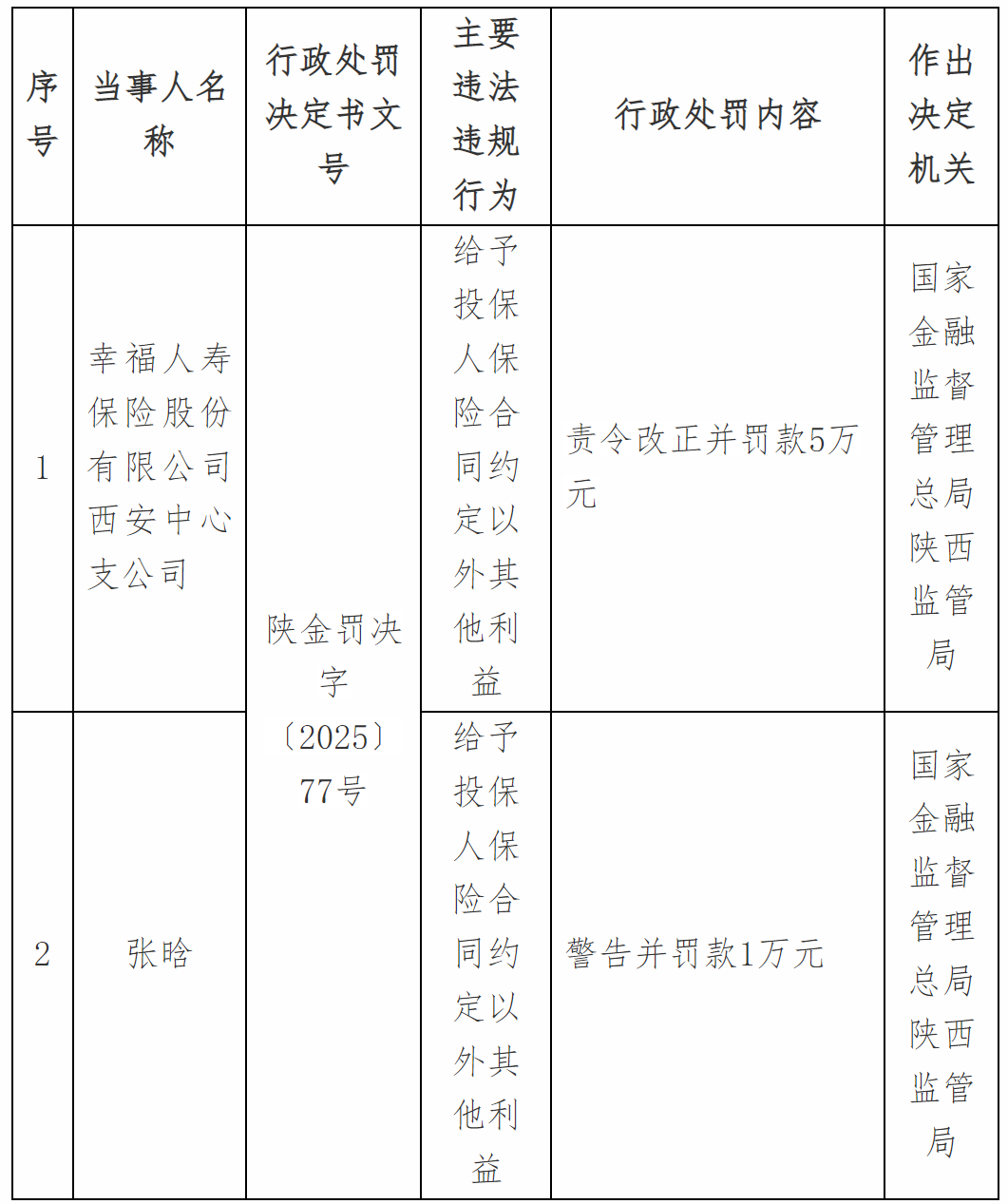 10月9日,国家金融监督管理总局陕西监管局发布的行政处罚信息显示,因给予投保人保险合同约定以外其他利益,幸福人寿保险股份有限公司西安中心支公司被责令改正并罚款5万元,张晗被警告并罚款1万元。