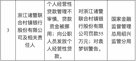 浙江诸暨联合村镇银行被罚55万元,涉贷款资金被挪用等