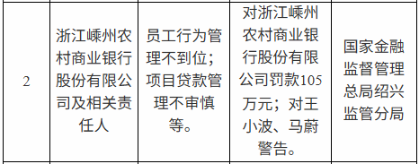 10月9日,国家金融监督管理总局绍兴监管分局披露的行政处罚信息公开表显示,浙江嵊州农村商业银行股份有限公司因员工行为管理不到位、项目贷款管理不审慎等违法违规行为,被罚款105万元;相关责任人王小波、马蔚被给予警告处罚。