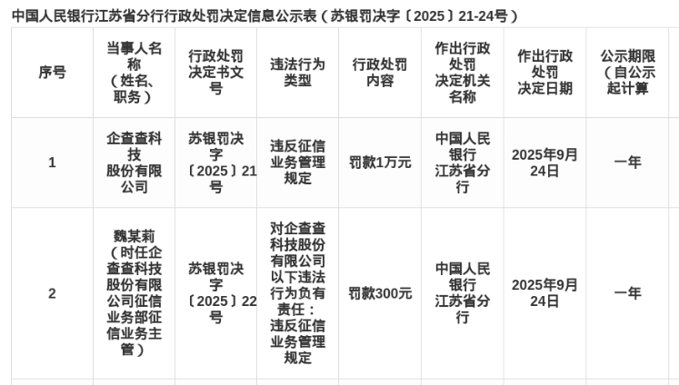 蓝鲸新闻10月9日讯,近日,中国人民银行江苏省分行发布了罚单,剑指企查查科技股份有限公司及其相关责任人。