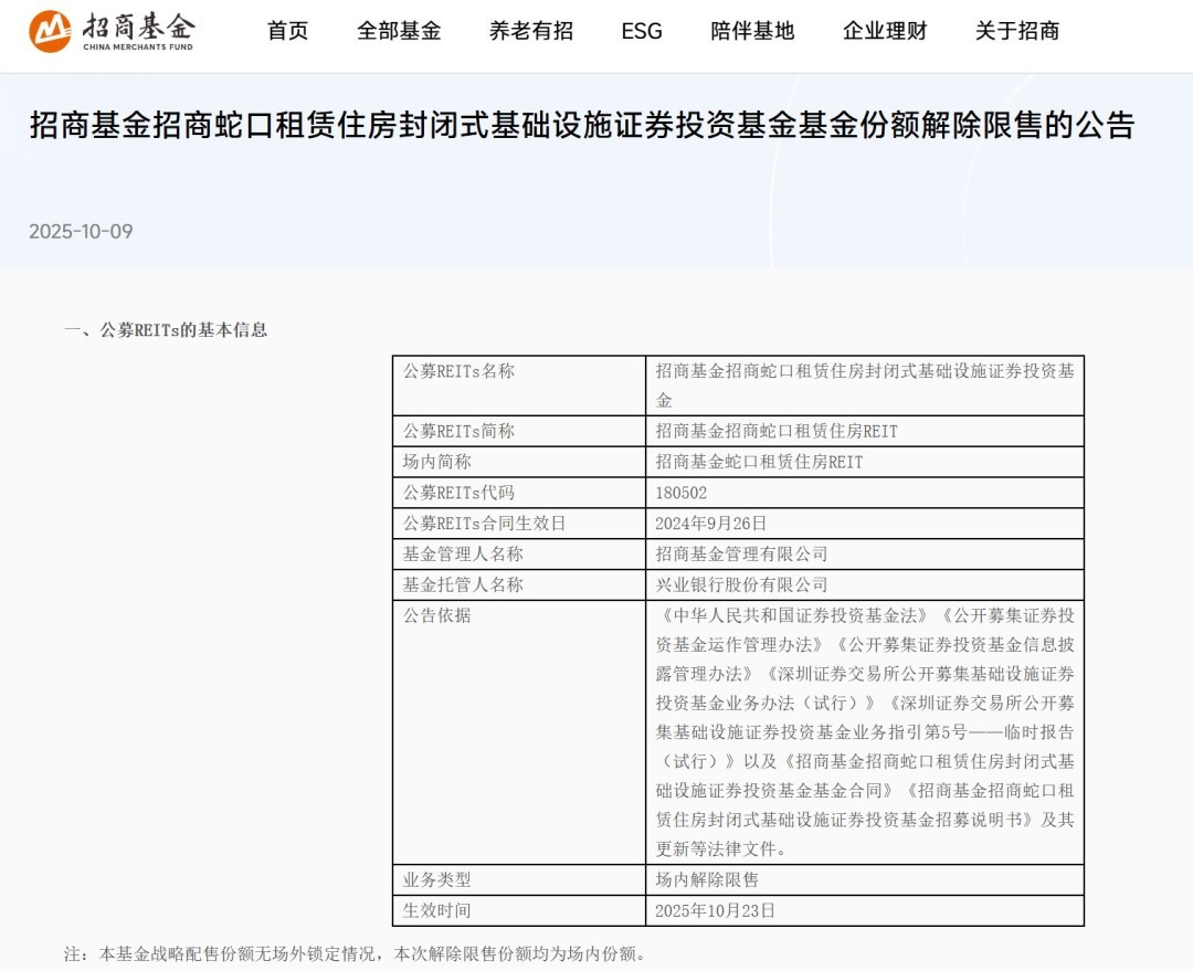 近日,基础设施公募REITs相继发布份额解除限售公告,引发市场关注。根据公告,招商基金蛇口租赁住房REIT与华夏合肥高新REIT将分别于10月23日和10月10日迎来战略配售份额解禁。