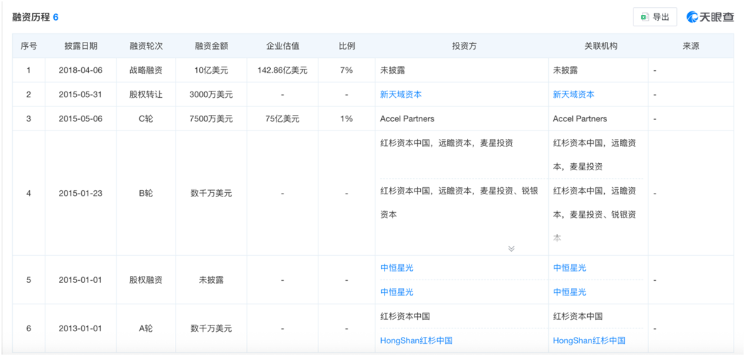 天眼查数据显示,大疆创新在2013年1月到2015年5月完成了5次融资,融资金额多的达7500万美元,少的也在数千万美元。投资方包括红杉资本中国、远瞻资本、麦星投资、中恒星光、新天域资本、AccelPartners等。