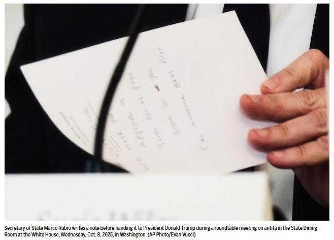 中新网10月9日电据美联社报道,当地时间8日,美国总统特朗普在举行一场圆桌会议时,国务卿鲁比奥向特朗普递上了一张纸条。