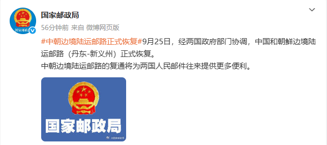 @国家邮政局 10月10日发布消息:9月25日,经两国政府部门协调,中国和朝鲜边境陆运邮路(丹东-新义州)正式恢复。