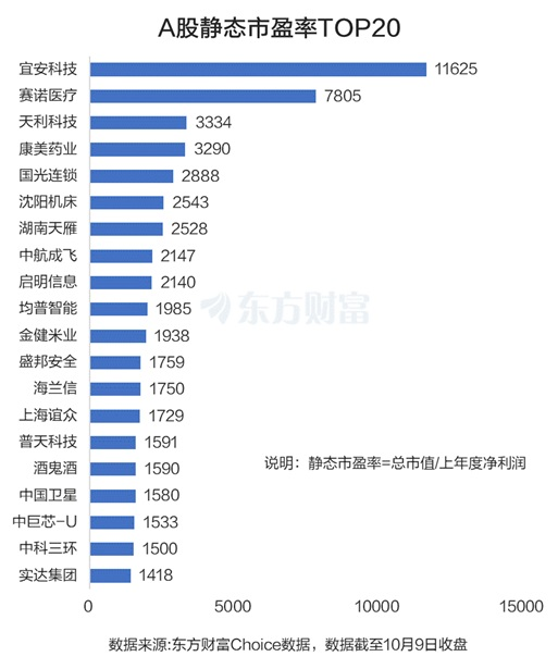 而全部A股来看,东方财富Choice数据显示,截至10月9日收盘,创业板公司宜安科技的静态市盈率最高,达11625倍。赛诺医疗紧随其后,静态市盈率为7805倍。