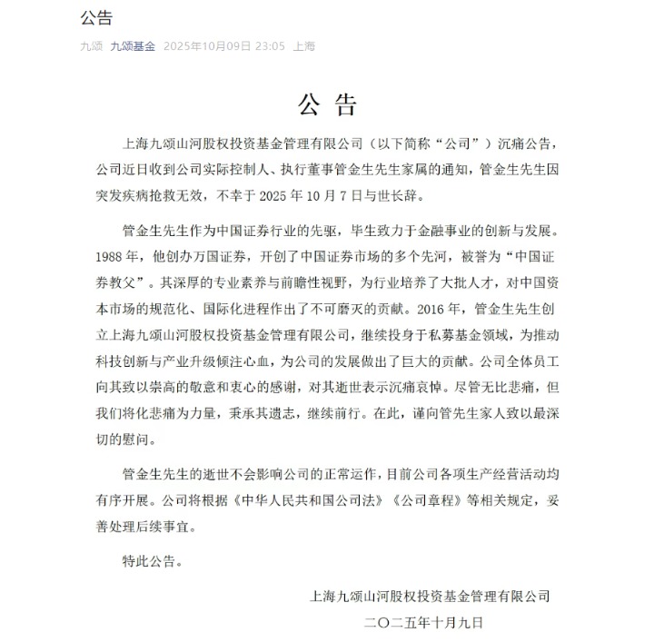 10月9日晚间,九颂基金公告,公司近日收到公司实际控制人、执行董事管金生家属的通知,管金生因突发疾病抢救无效,不幸于2025年10月7日与世长辞。