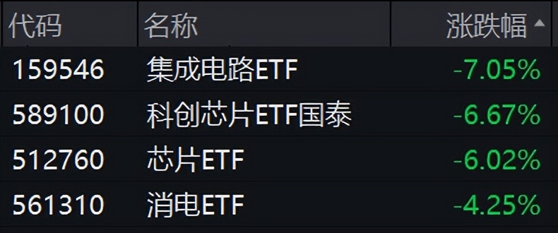 市场全天震荡调整,三大指数集体下跌。沪深两市成交额2.52万亿元,较上一个交易日缩量1376亿元。截至收盘,沪指跌0.94%,深成指跌2.70%,创业板指跌4.55%。半导体板块下跌明显,集成电路ETF下跌7.05%,科创芯片ETF下跌6.67%,芯片ETF下跌6.02%,消电ETF由于其中的半导体和其他算力成分,也下跌了4.25%。